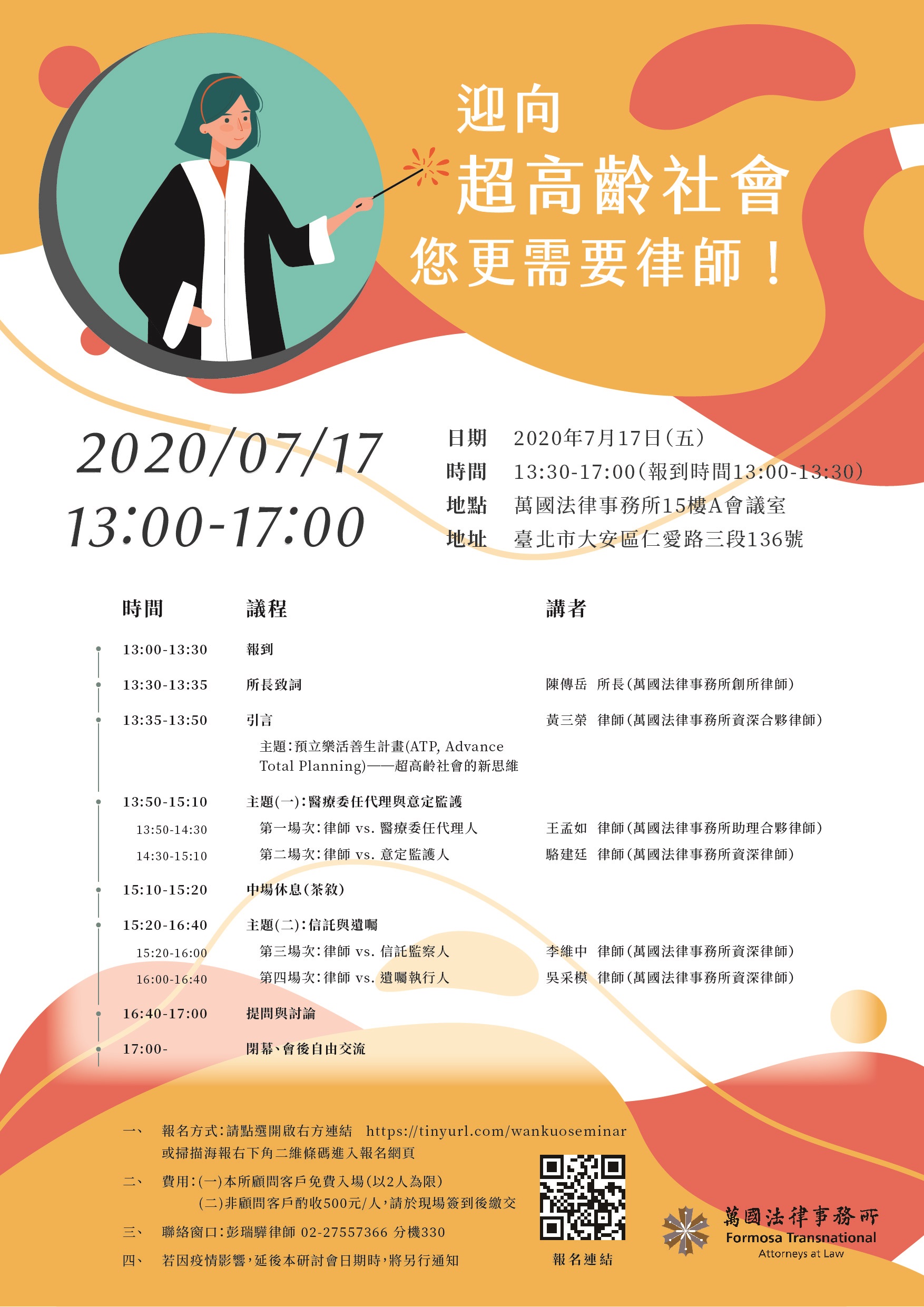 萬國法律事務所成立於1974年10月7日,長期以「心繫公義,實踐法治,服務社會」為目標,基此理念並放眼超高齡社會之趨勢,特舉辦本次研討會,將律師得於您的「醫療決定」、「意定監護」、「信託」、「遺囑」之四大面向的規劃,所扮演的角色、得提供之服務,予以深入淺出的介紹、說明,期待您的參與,開啓面對「超高齡社會」所必需超前部署之第一步!