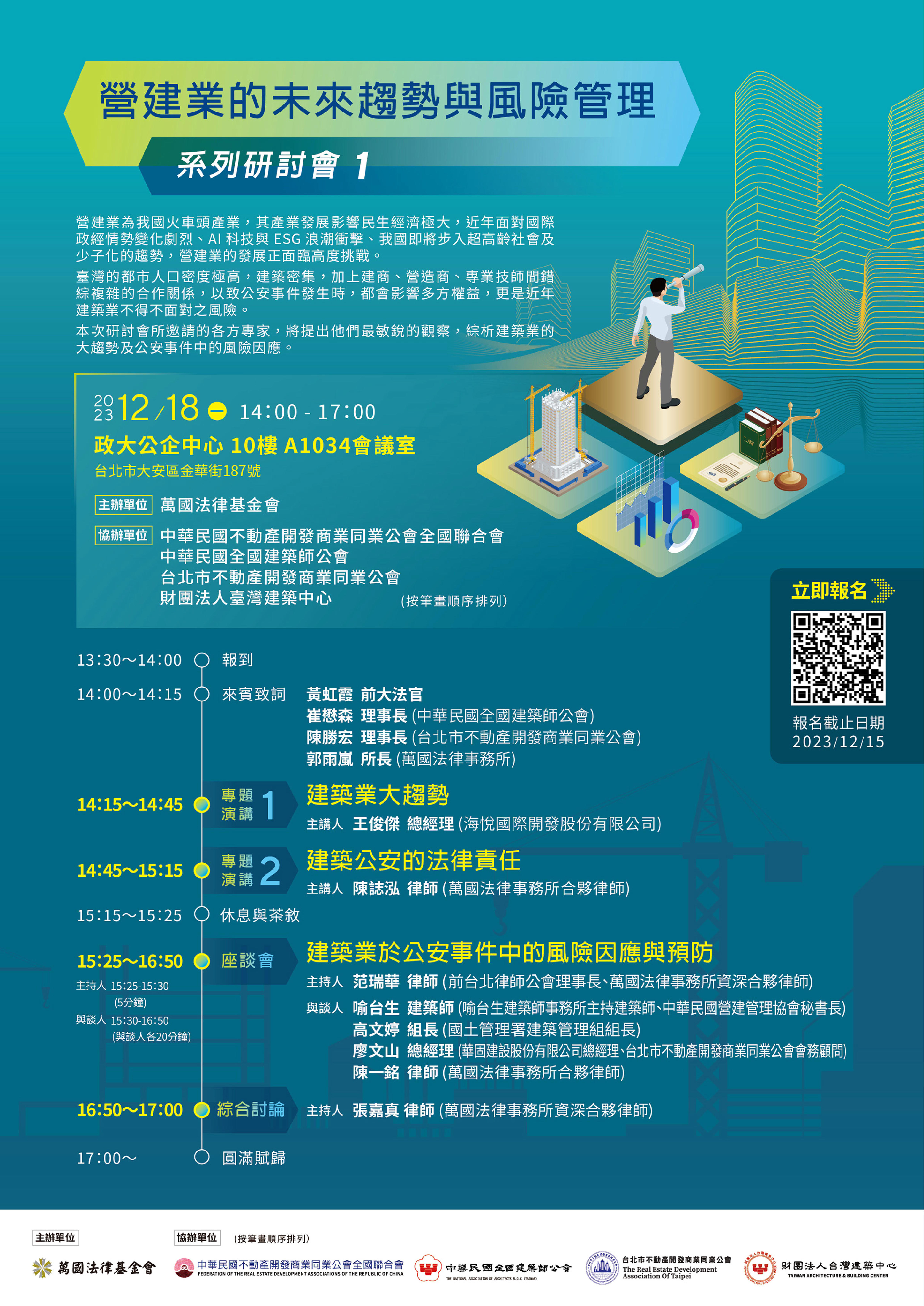 本所將於十二月十八日舉辦「營建業的未來趨勢與風險管理」,歡迎報名參加。