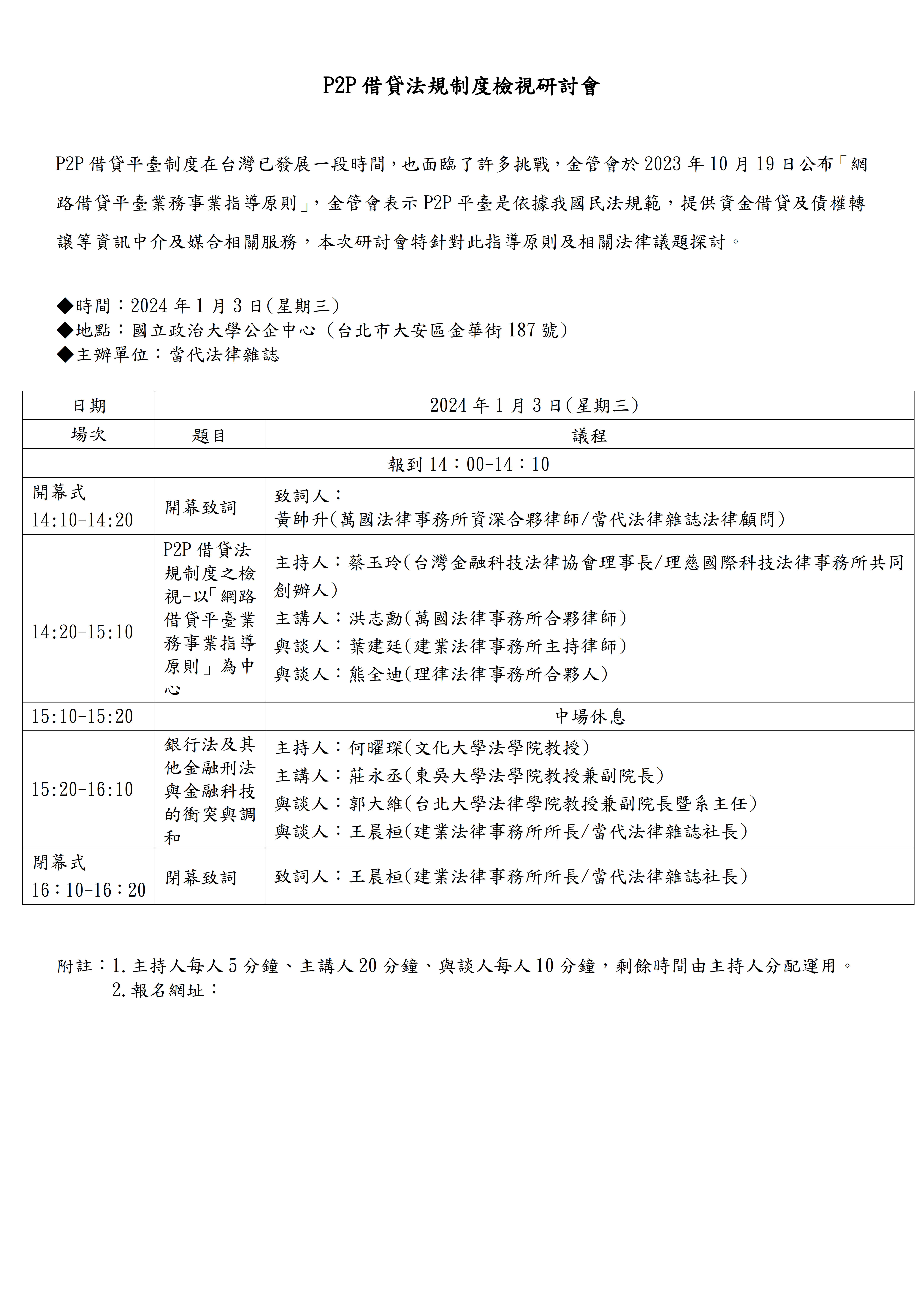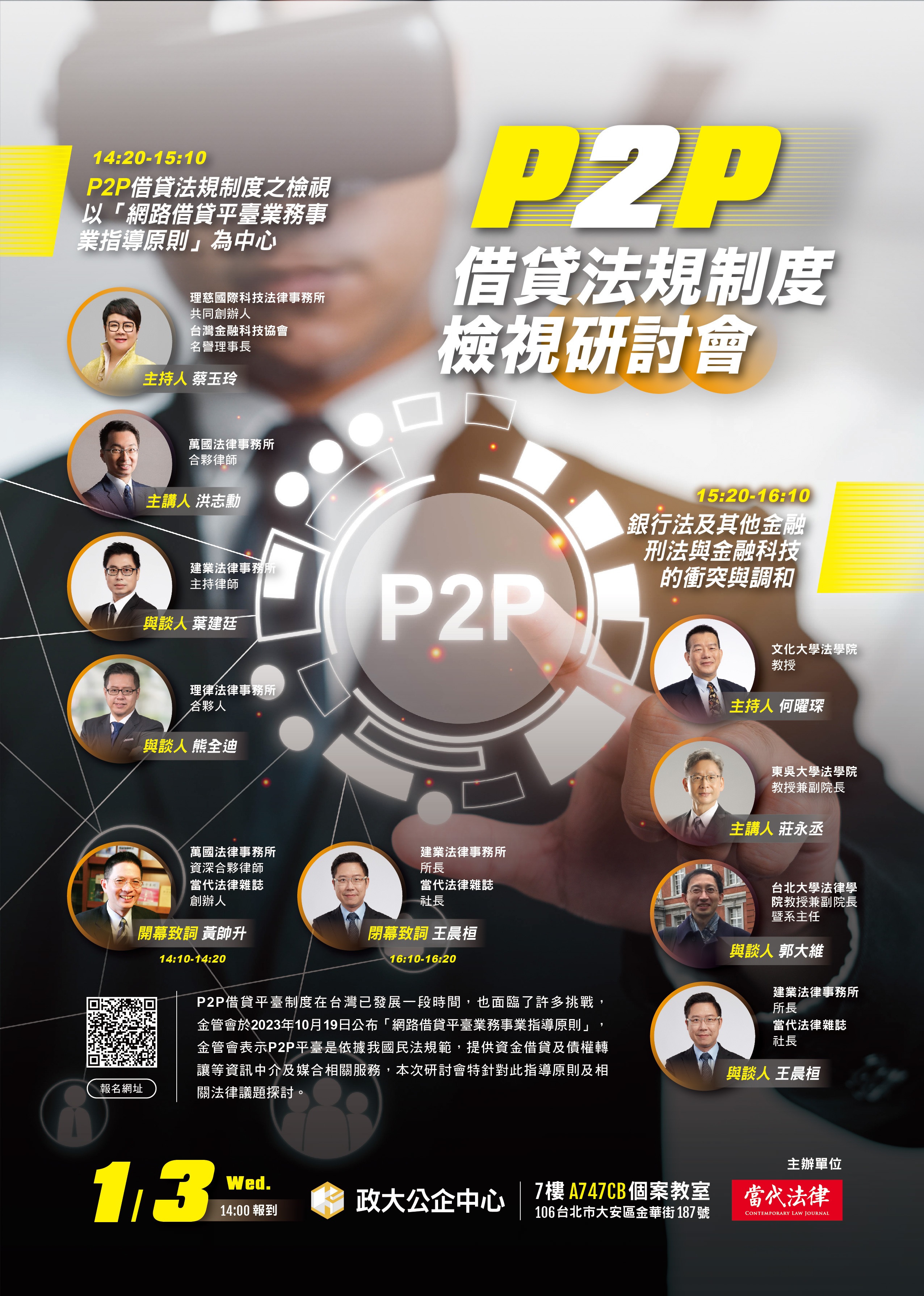 本所資深合夥律師黃帥升及洪志勳合夥律師應邀出席「P2P 借貸法規制度檢視 」研討會,分別擔任開幕致詞及主講人。