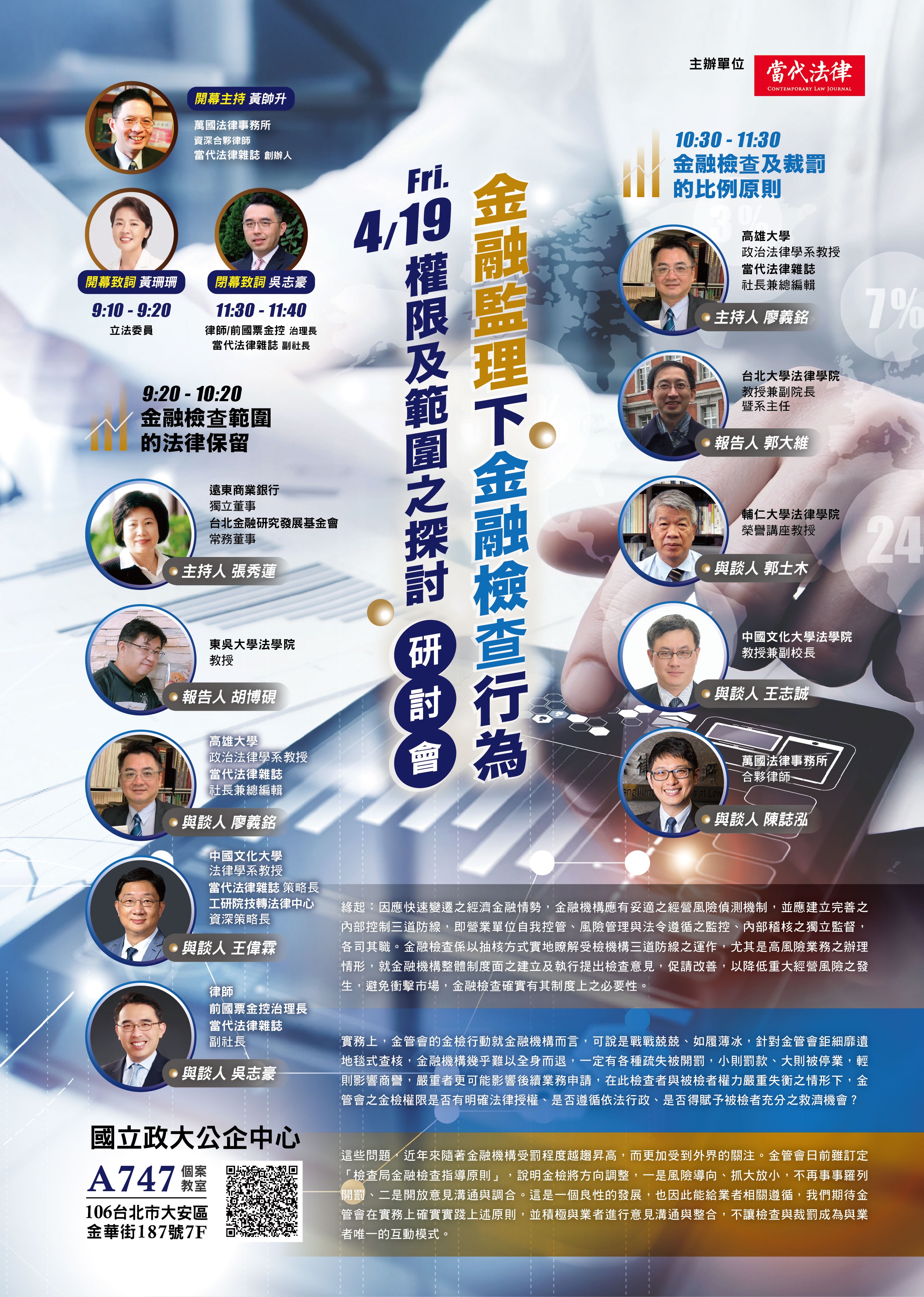 本所資深合夥人黃帥升及合夥律師陳誌泓應邀於「金融監理下金融檢查行為權限及範圍之探討」研討會擔任開幕主持及與談人。