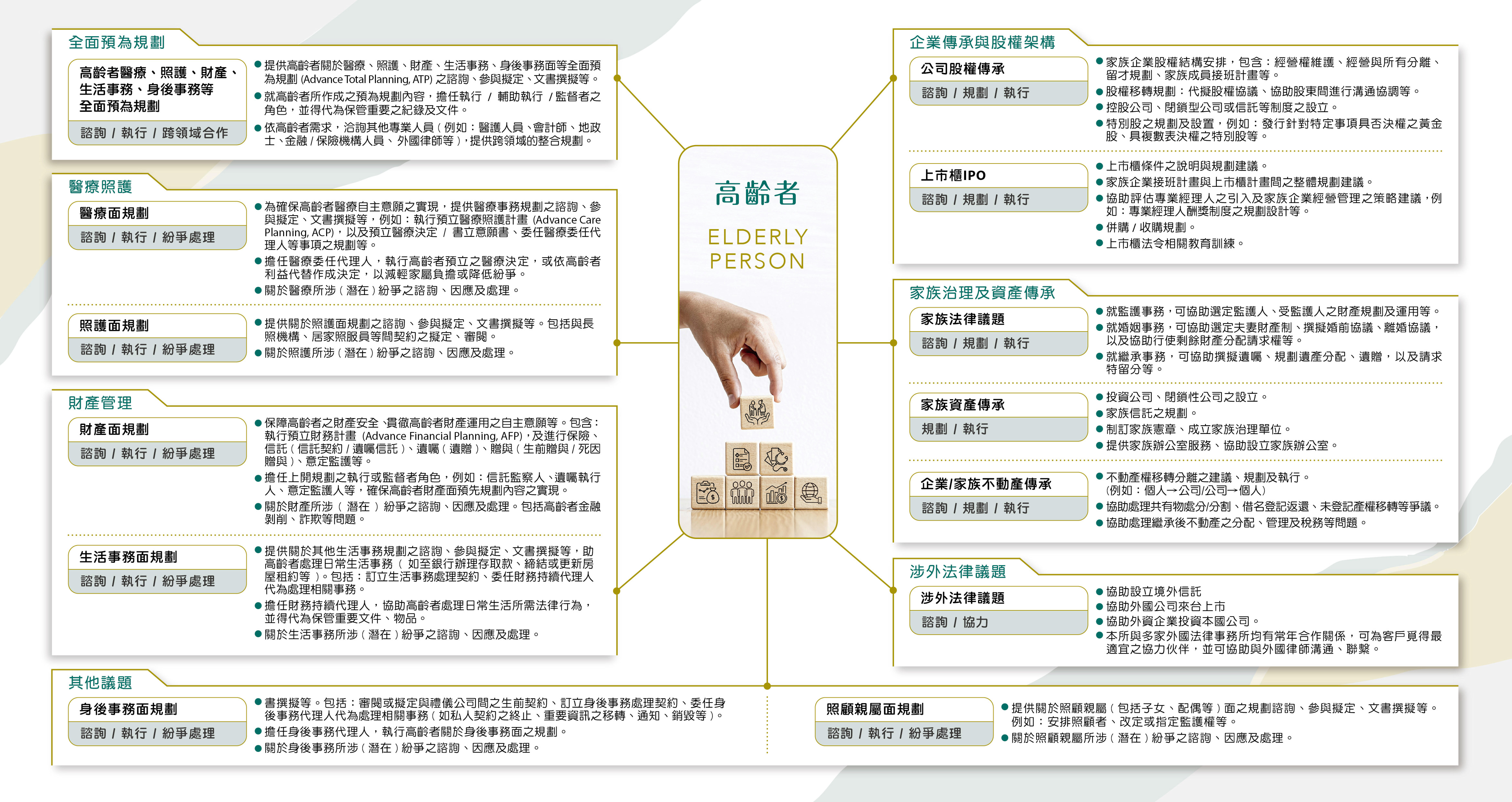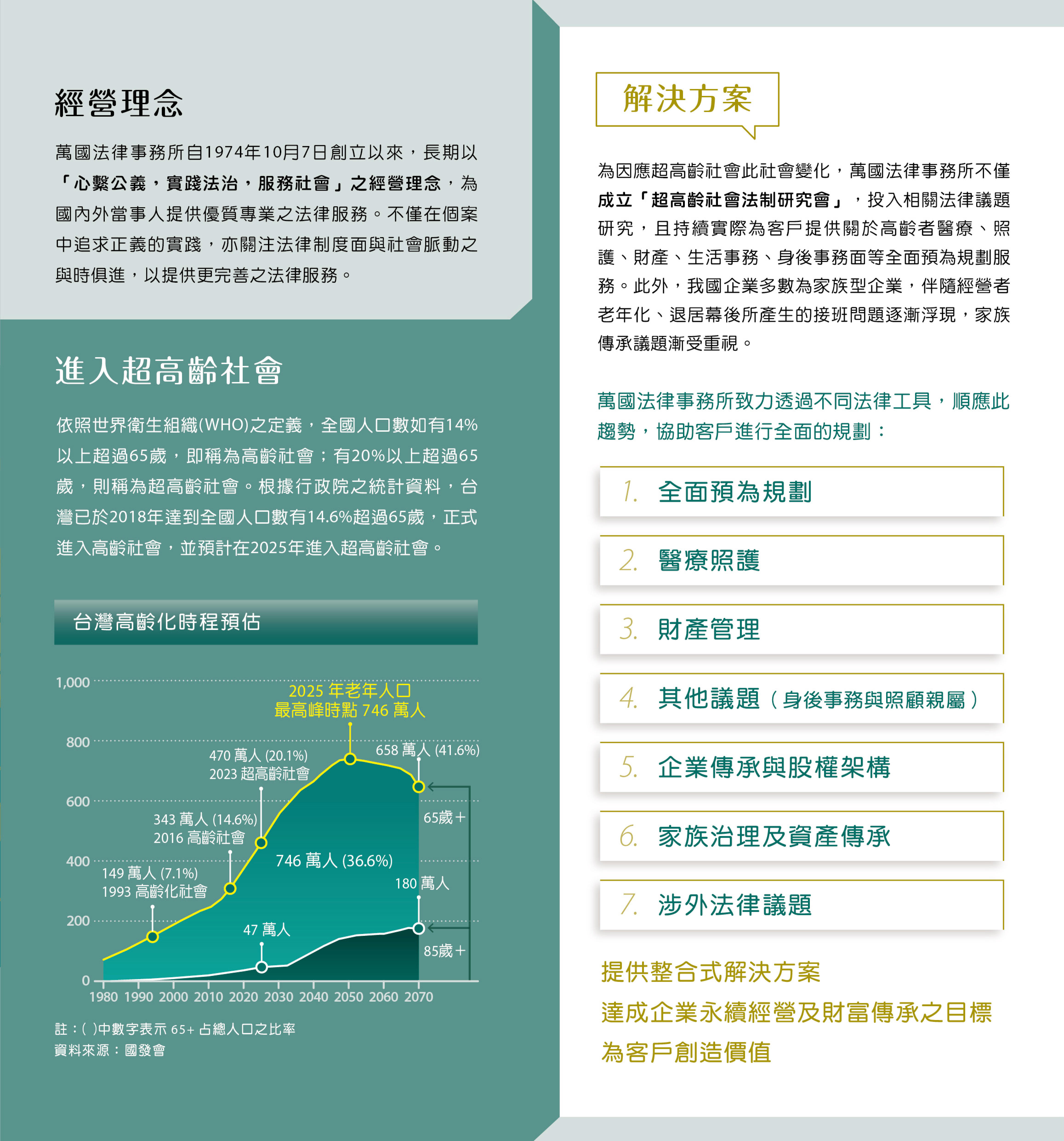 為因應超高齡社會此社會變化,萬國法律事務所不僅成立「超高齡社會法制研究會」,投入相關法律議題 研究,且持續實際為客戶提供關於高齡者醫療、照 護、財產、生活事務、身後事務面等全面預為規劃服務。此外,我國企業多數為家族型企業,伴隨經營者老年化、退居幕後所產生的接班問題逐漸浮現,家族 傳承議題漸受重視。