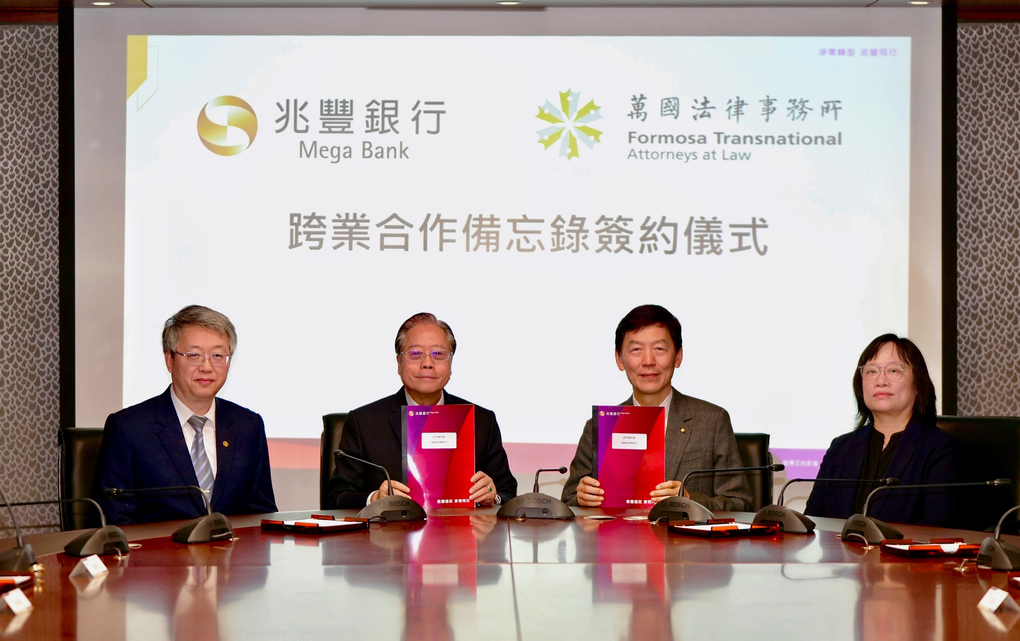 兆豐銀行董事長雷仲達(左二)、副總經理陳建中(左一)與萬國法律律師事務所所長郭雨嵐(右二)、資深合夥律師林雅芬(右一)共同簽署跨業合作備忘錄。