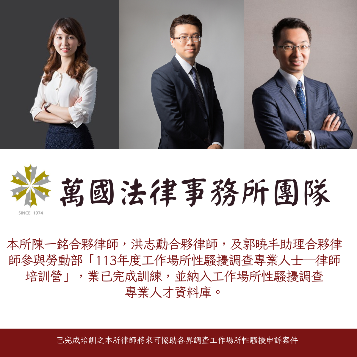 本所陳一銘合夥律師,洪志勳合夥律師,及郭曉丰助理合夥律師參與勞動部「113年度工作場所性騷擾調查專業人士—律師培訓營」,業已完成訓練,並納入工作場所性騷擾調查專業人才資料庫。