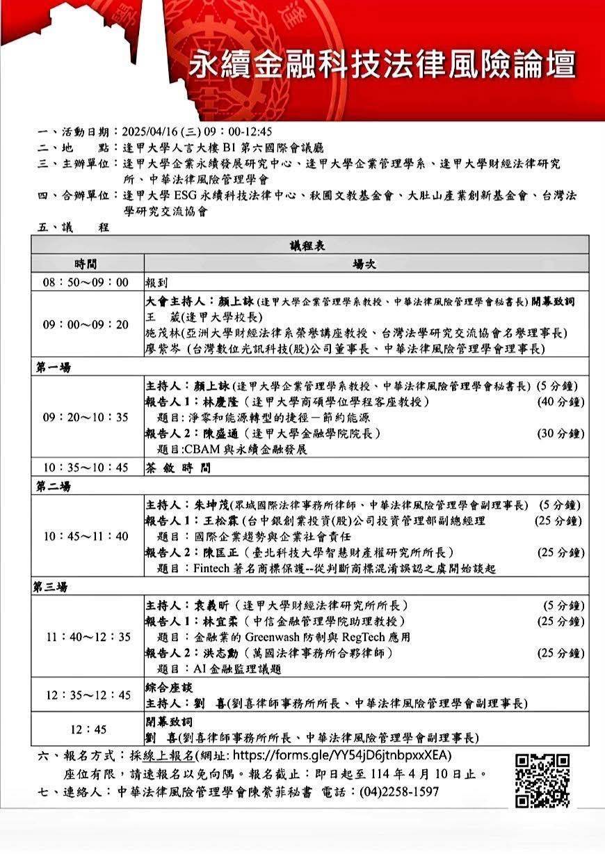 本所洪志勳合夥律師應邀於『永續金融科技法律風險論壇』擔任報告人,題目為:AI金融監理議題。