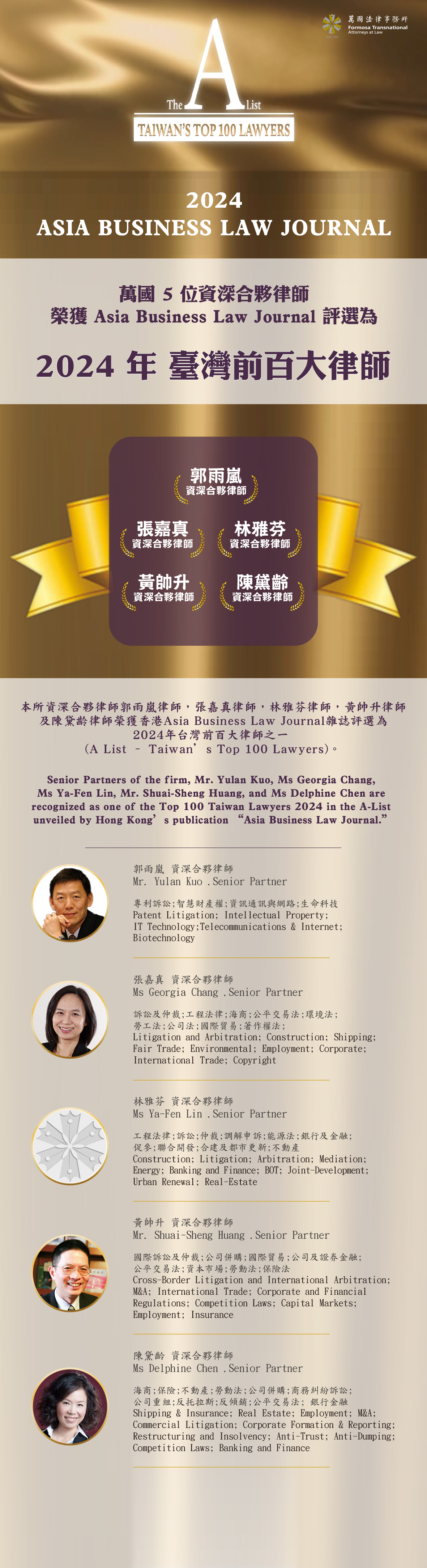 Five senior partner lawyers were selected as one of Taiwan's Top 100 Lawyers in 2024 by Asia Business Law Journal.