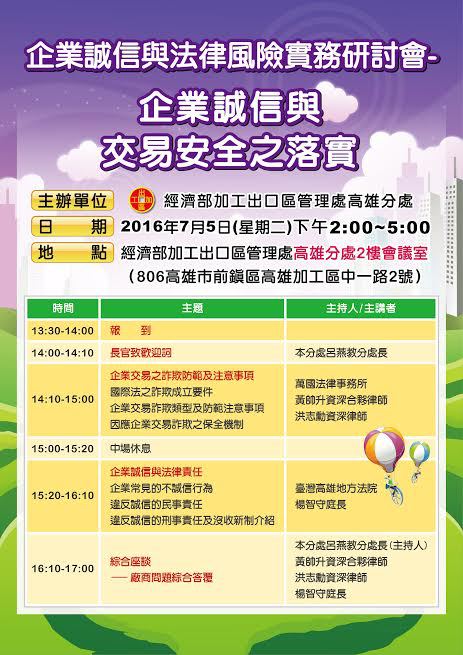 当所黄帥升シニアパートナー弁護士及び洪志勳シニア弁護士がお招きに応じて「2016年企業信義と法的リスク実務」セミナーの講演者を務めます